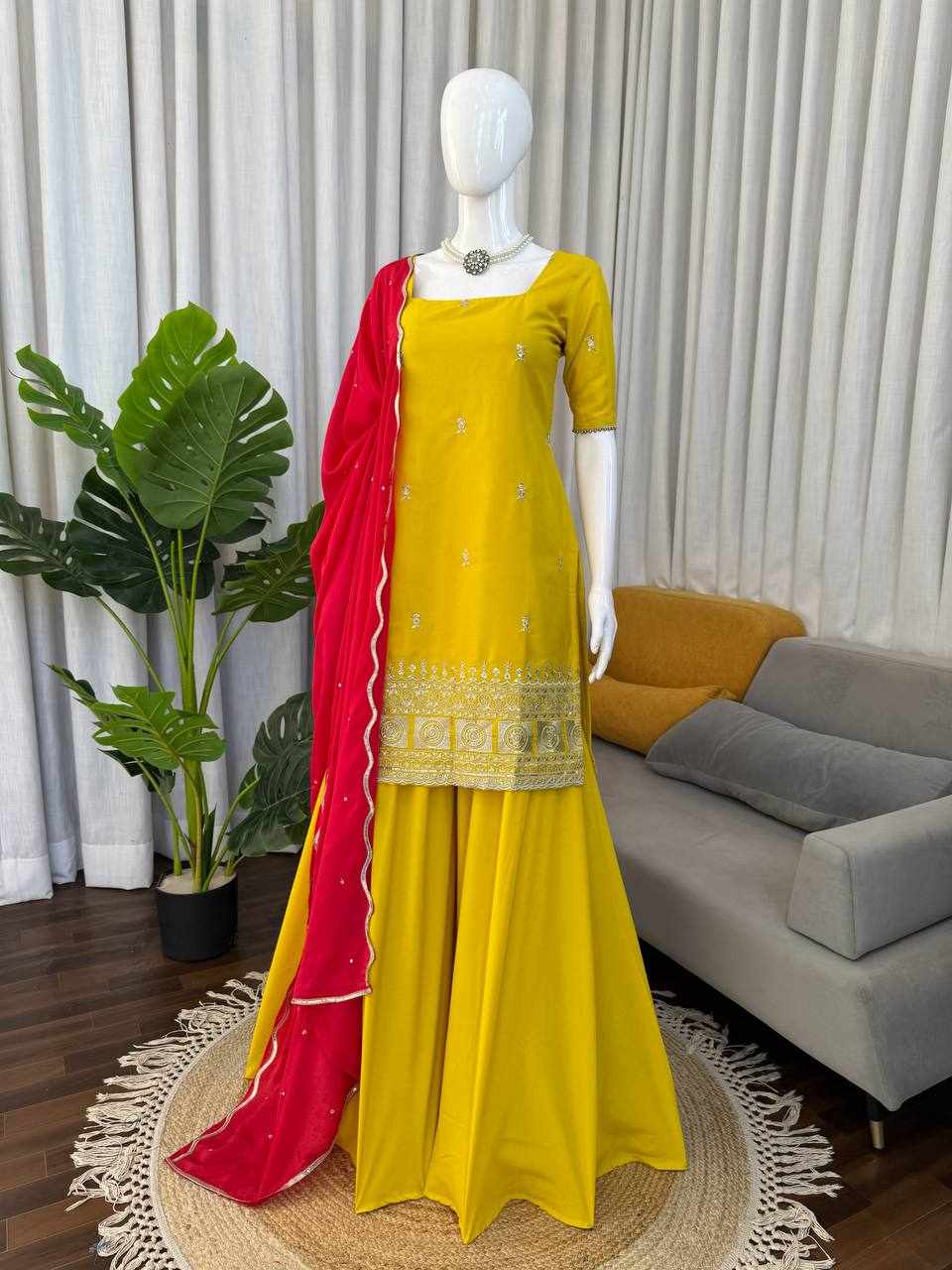 Step into effortless grace with this beautifully crafted sharara set, designed for festive charm and sophisticated style.
