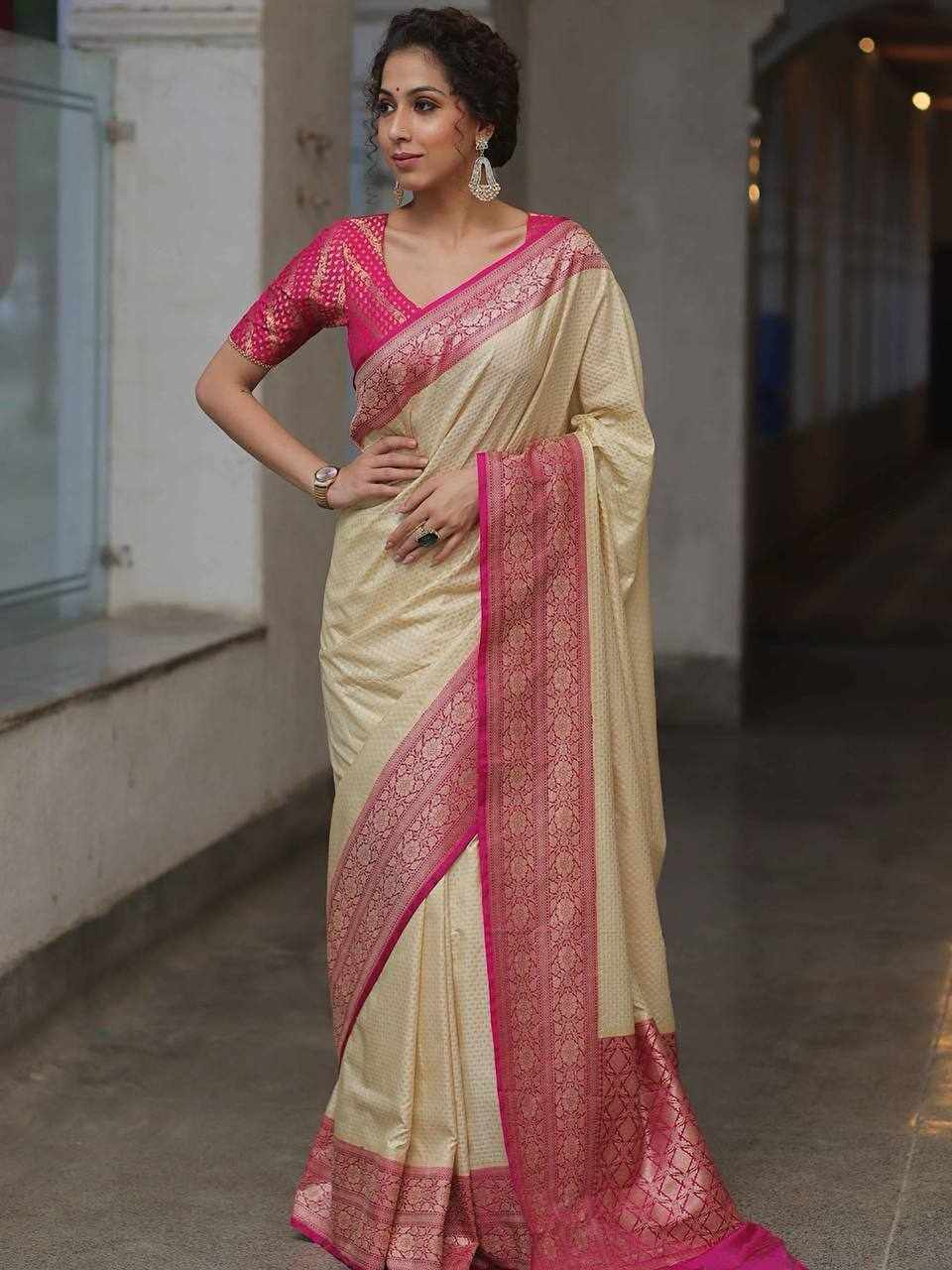 Design: Beautiful rich pallu with intricate jacquard work woven all over the saree, offering a graceful and luxurious look