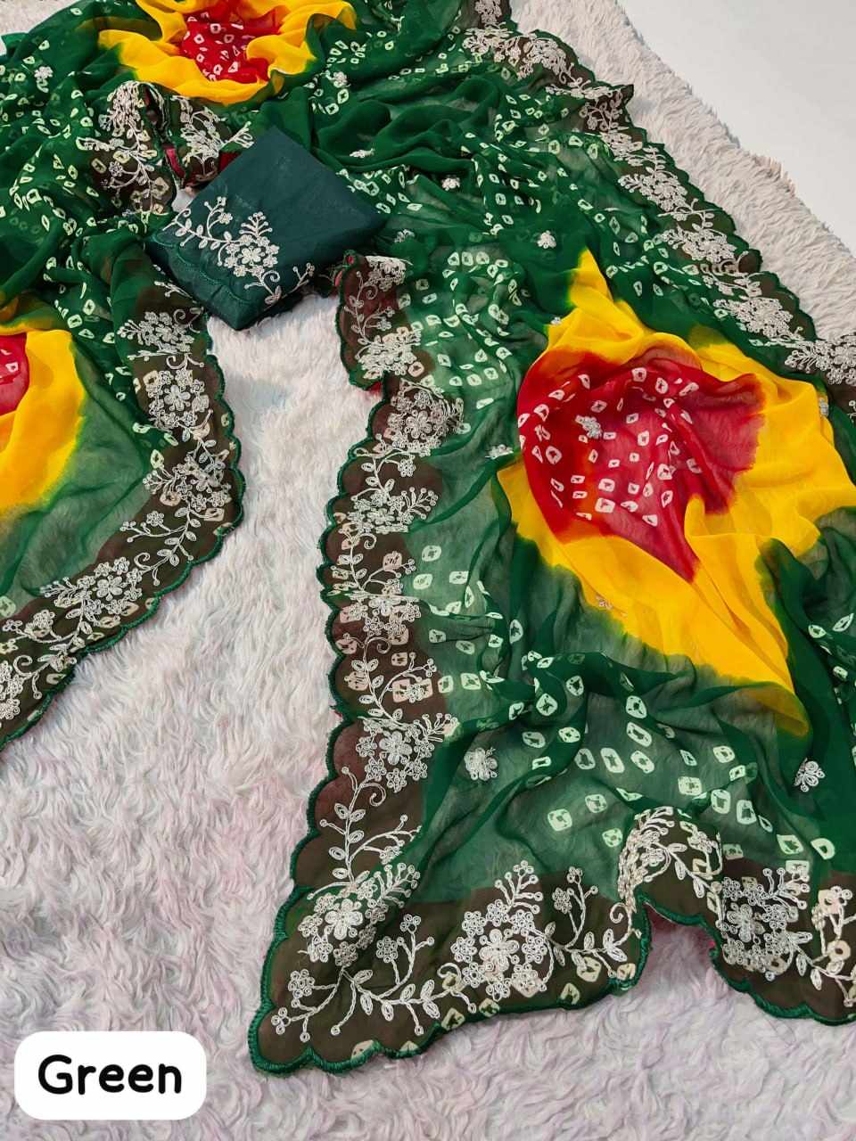 | Name : | PIYU P1038 MULTI COLOR GREEN BANDHANI Saree |