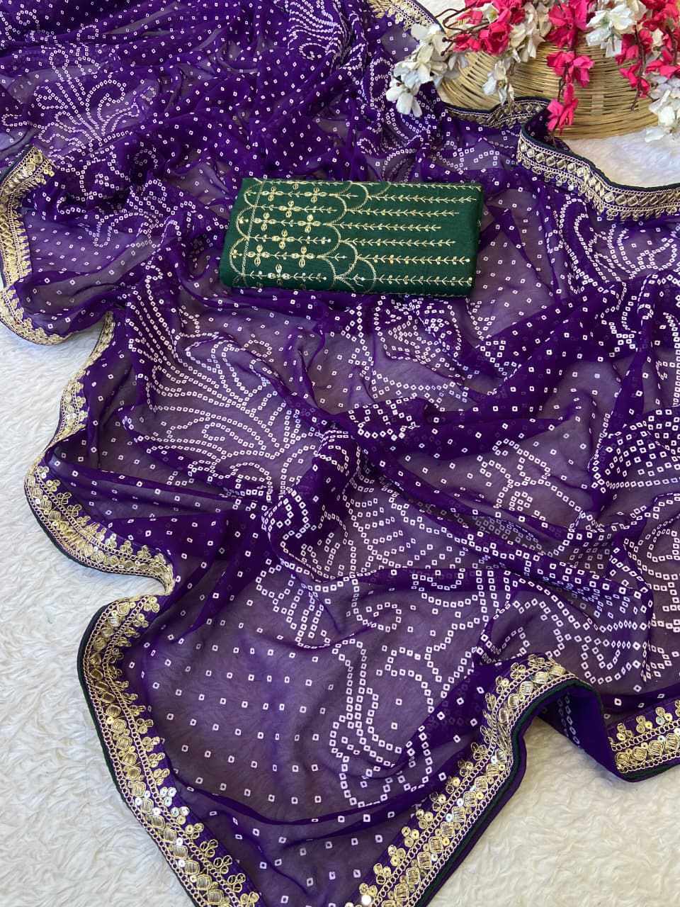 | Name : | RC Purple Bandhej Georgette heavy Coding Sequence border Saree |